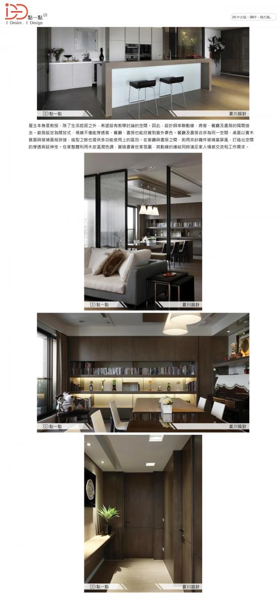 屋主本身是教授,除了生活起居之外,希望設有教學討論的空間。因此,設計師串聯動線,將客、餐廳及書房的隔間捨去。廚房設定為開放式,視線不僅能穿透客、餐廳、書房也能欣賞到窗外景色。餐廳及書房合併為同一空間,桌面以實木質面與玻璃面做拼接,造型之餘也提供多功能使用上的區別。在客廳與書房之間,則用夾紗鐵件玻璃當屏風,打造出空間的穿透與延伸性。住家整體利用木皮溫潤色調,營造書香世家氛圍,其動線的連結同時滿足家人情感交流和工作需求。