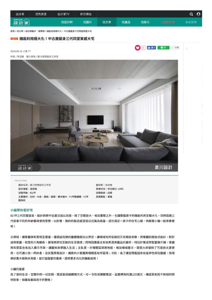 小編帶你看好宅 60 坪三代同堂居家,設計師將中古屋況加以改造,除了空間放大、格局重整之外,也讓整個房子的機能利用至極大化,同時因應三代居者不同的年齡層與使用習慣,以耐看、簡約的飯店感混搭日式風為底蘊,成功滿足一家子的住宅心願,快跟著小編一起來看看吧! 公領域,讓客廳與和室相互連通,僅透過低矮的量體檯面加以界定,讓場域有所區隔但又有開放串聯,而餐廳的開放式設計,則形成與客廳、和室的三角關係,展現高密切互動的生活情境;同時因應屋主有收集酒與藝品的喜好,特別於餐桌旁配置展示櫃,客廳與和室區也各加入展示吊架,讓藝術美學融入生活;主臥室,於睡眠區架高地板,增加場域層次,兩張大床墊除了可提供夫妻使用,也可讓小孩一同休息,且安置屏風設計,讓房內小客廳與睡眠區有所區隔;次臥,為了讓空間看起來有延伸性與完整感,採用條狀實木修飾床背板,並打造臨窗的書桌,提供更多元化的機能使用! 小編的最愛 為了便利生活,空間中的一切空調、燈源皆採總開關方式,可一次性地開關電源,並選擇飛利浦LED燈光,傳遞柔和而不刺眼的照明效果,保護長輩與孩子的雙眼!