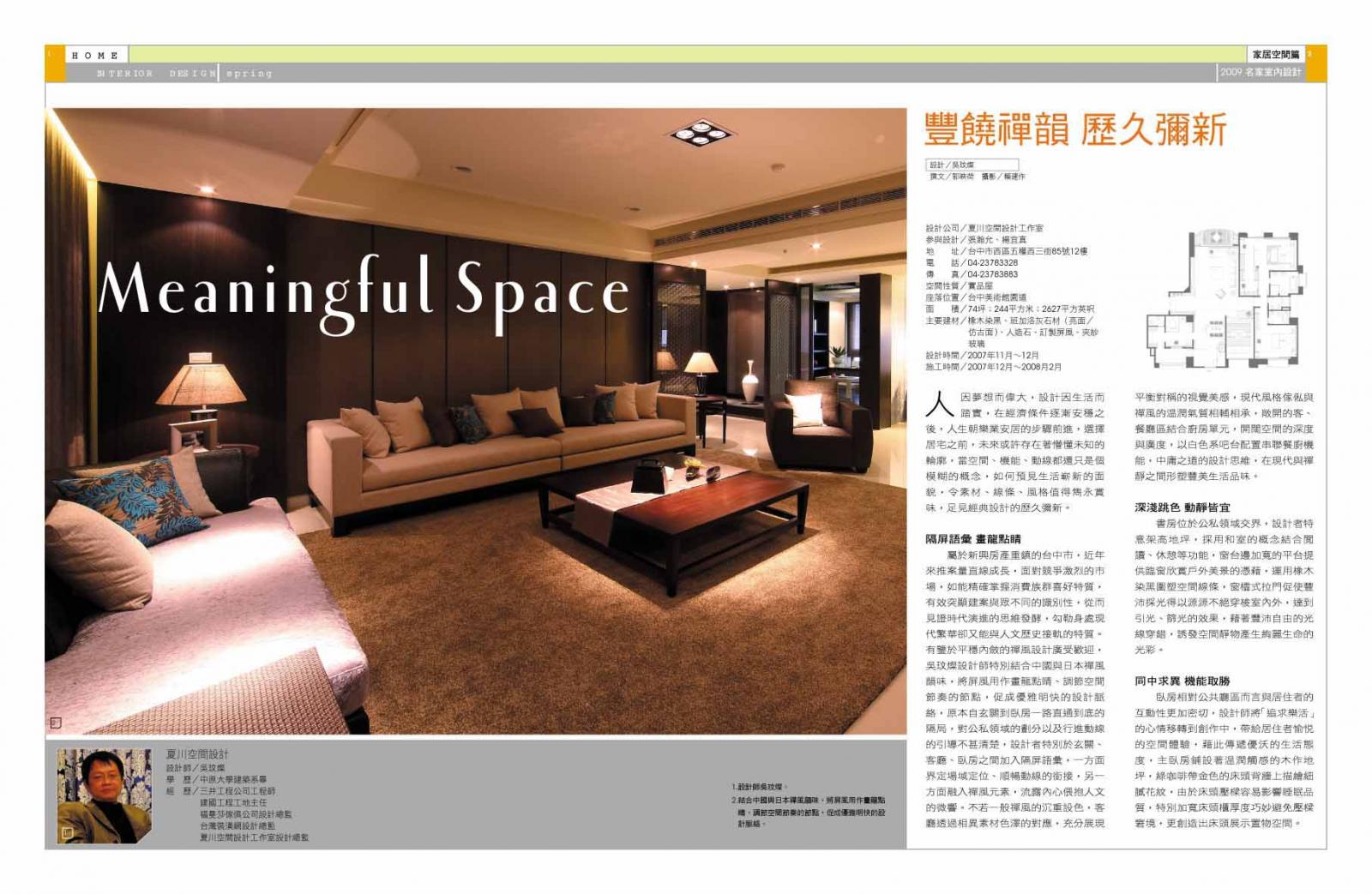 屬於新興房產重鎮的台中市,近年來推案量直線成長,面對競爭激烈的市場,如能精確掌握消費族群喜好特質,有效突顯建案與眾不同的識別性,從而見證時代演進的思維發酵,勾勒身處現代繁華卻又能與人文歷史接軌的特質。有鑒於平穩內斂的禪風設計廣受歡迎,吳玟燦設計師特別結合中國與日本禪風韻味,將屏風用作畫龍點睛、調節空間節奏的節點,促成優雅明快的設計脈絡,原本自玄關到臥房一路直通到底的隔局,對公私領域的劃分以及行進動線的引導不甚清楚,設計者特別於玄關、客廳、臥房之間加入隔屏語彙,一方面界定場域定位、順暢動線的銜接,另一方面融入禪風元素,流露內心偎抱人文的微響。不若一般禪風的沉重設色,客廳透過相異素材色澤的對應,充分展現平衡對稱的視覺美感,現代風格傢俬與禪風的溫潤氣質相輔相承,敞開的客、餐廳區結合廚房單元,開闊空間的深度與廣度,以白色系吧台配置串聯餐廚機能,中庸之道的設計思維,在現代與禪靜之間形塑豐美生活品味。