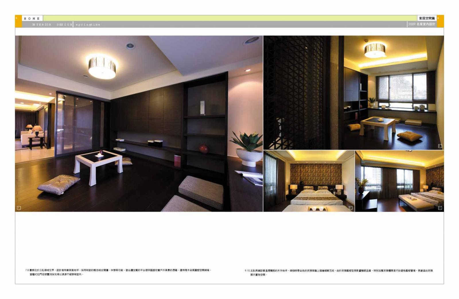 書房位於公私領域交界,設計者特意架高地坪,採用和室的概念結合閱讀、休憩等功能,窗台邊加寬的平台提供臨窗欣賞戶外美景的憑藉,運用橡木染黑圍塑空間線條,窗櫺式拉門促使豐沛採光得以源源不絕穿梭室內外,達到引光、篩光的效果,藉著豐沛自由的光線穿錯,誘發空間靜物產生絢麗生命的光彩。